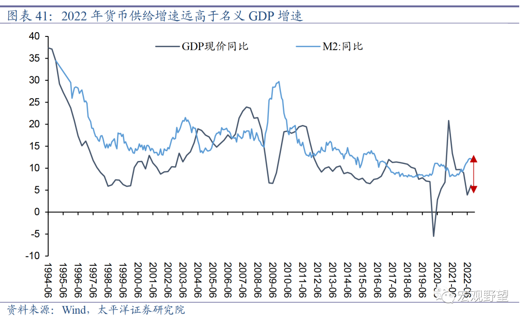 不过,虽然面临着海外的制约,2022年中国在“稳增长”的主基调下,政策宽松的力度整体上仍是比较强的。财政政策方面,2022年广义财政赤字同比差额远远高于过去几年的水平,甚至远高于2020年第一波疫情期间的力度。货币政策方面,自2016年“供给侧改革”以来,中国政策总体上重视供给侧调整而淡化需求侧刺激,所以货币供给增速出现了系统性的下降,但2022年中国货币供给M2增速达到了2016年以来的最高值,也就是说货币政策实际上力度也是比较强的。
