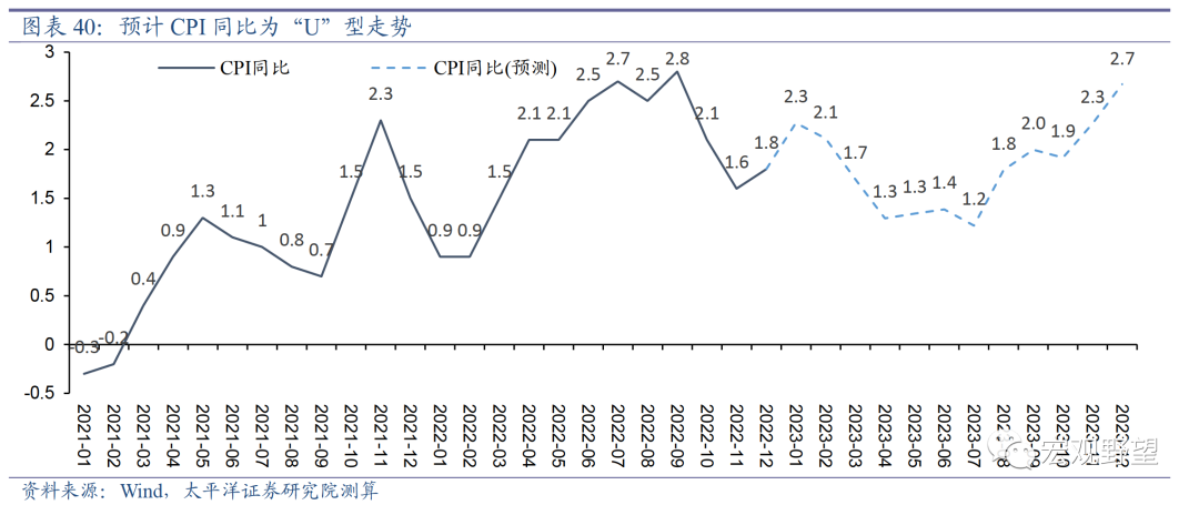 其次,2023年油价可能较弱。虽然中国经济在复苏之中,但是海外各国经济普遍下行,全球总需求正在萎缩,对于油价是较大的利空因素。同时2022年俄乌冲突造成的原油供给紧张的情形正在边际改善。我们预计2023年油价将延续下行趋势。所以,我们认为2023年可能是猪油共振向下的格局,这决定了中国难有全面性的高通胀。预计全年CPI同比为“U”型走势,上半年在猪价与油价的下行压力及基数迅速抬升的影响下通胀趋于下行。下半年在内需进一步扩张的拉动下CPI同比有望重新向上,但全年突破3%的可能性并不高。