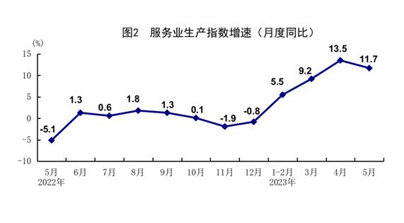 5月份,全国服务业生产指数同比增长11.7%,比上月回落1.8个百分点。分行业看,住宿和餐饮业,租赁和商务服务业,批发和零售业,信息传输、软件和信息技术服务业生产指数同比分别增长39.5%、14.0%、13.2%、12.9%。1-5月份,全国服务业生产指数同比增长9.1%,比1-4月份加快0.7个百分点。1-4月份,规模以上服务业企业营业收入同比增长6.9%。5月份,服务业商务活动指数为53.8%,业务活动预期指数为60.1%,其中,铁路运输、水上运输、航空运输、电信广播电视及卫星传输服务、互联网软件及信息技术服务等行业商务活动指数位于60%以上高位景气区间。
