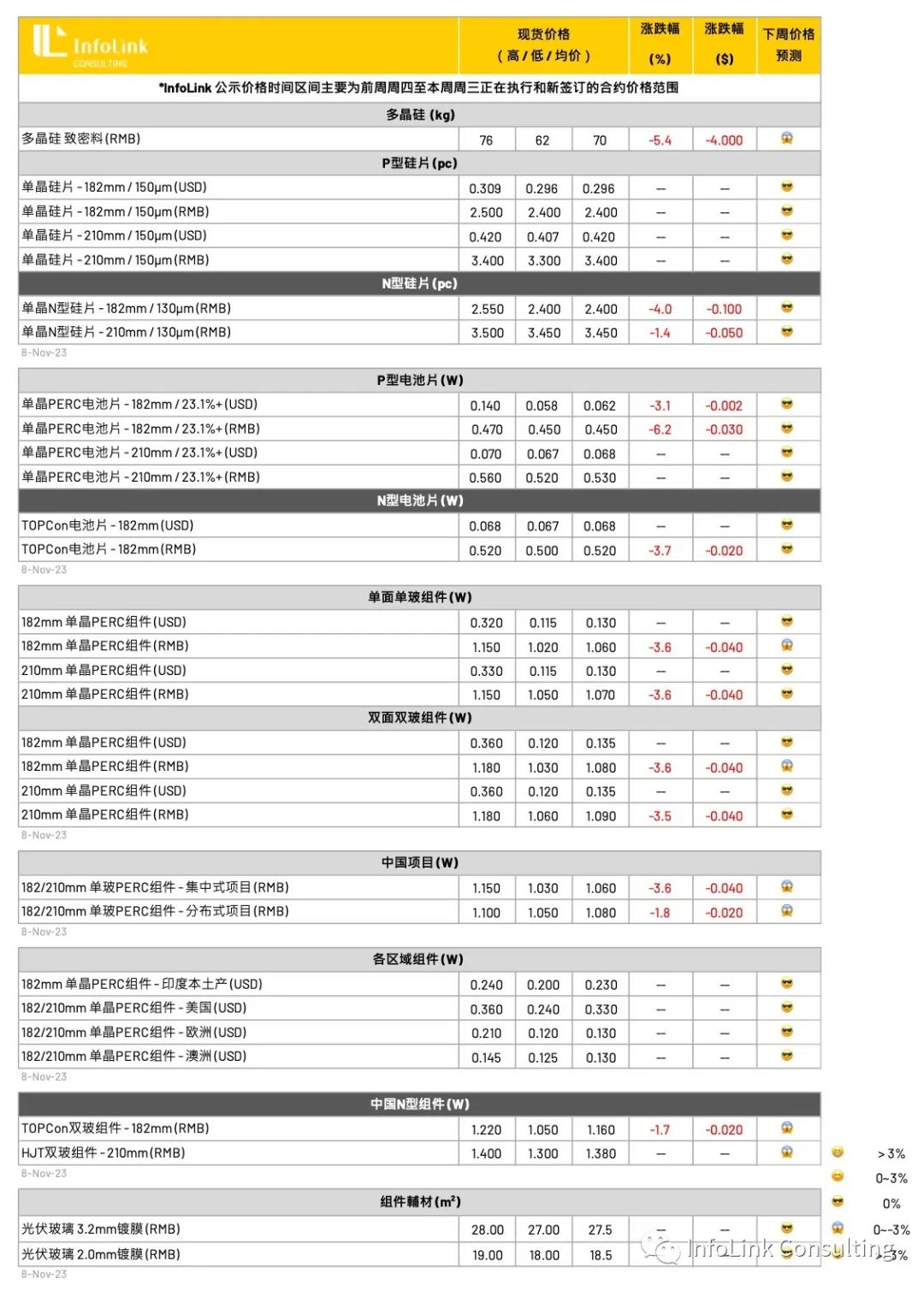 观察下周,在硅片价格即将触底下,预期成交价格下周难以轻易突破,厂家仍在观望电池环节排产变化,然而,截至目前,多数电池厂家尚无明显减产规划,硅片环节自身库存积累速度与下游排产将持续牵引后续价格变化。