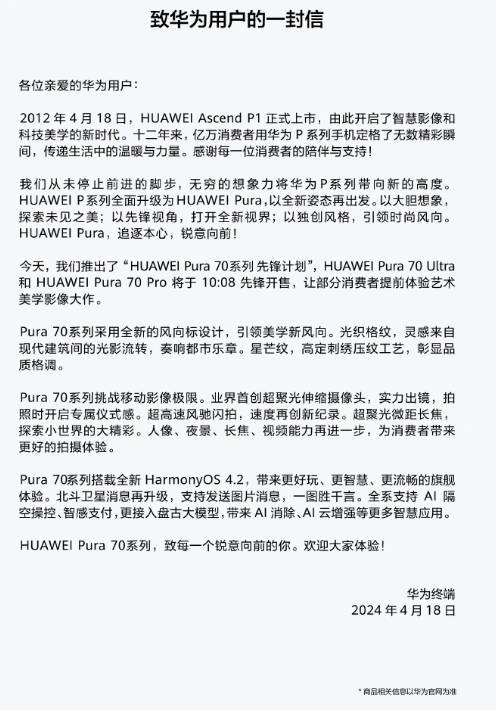 4月18日,华为终端官宣,4月18日10:08,华为Pura70 Ultr