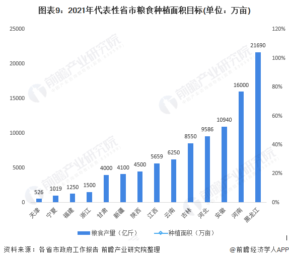 2021年稳定粮食播种面积,严守国家18亿亩耕地红线,其中黑龙江省作为我国第一产量大省,2021年规划粮食种植面积粮食播种面积达2.169亿亩。河南省及安徽省粮食种植面积也均超过1亿亩。除此之外,各省市在2021年致力于粮食种植面积稳定,粮食单产及品质明显提升。