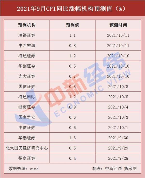 今日(14日)上午,国家统计局将公布2021年9月份居民消费价格指数(CPI)。多家机构预测均值显示,9月CPI同比上涨0.8%,增幅与8月持平。