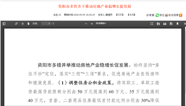 5月5日,资阳市也出台六方面措施稳地产,其中提出,5月1日至31日,开展“网络房交会+”商品房促销活动,推出购房楼盘送2万元现金补贴,家电、家居建材、装修商家消费券、万元现金消费券免费领等8大福利,带动房地产及上下游产业销售,促进消费。此外,还提出调整住房公积金政策,最高贷款限额提高到60万元,首套房最低首付款比例降到20%,推行高层次人才“又提又贷”,最高贷款额度提高到70万元;引导住房贷款利率下行;优化预售资金监管等。