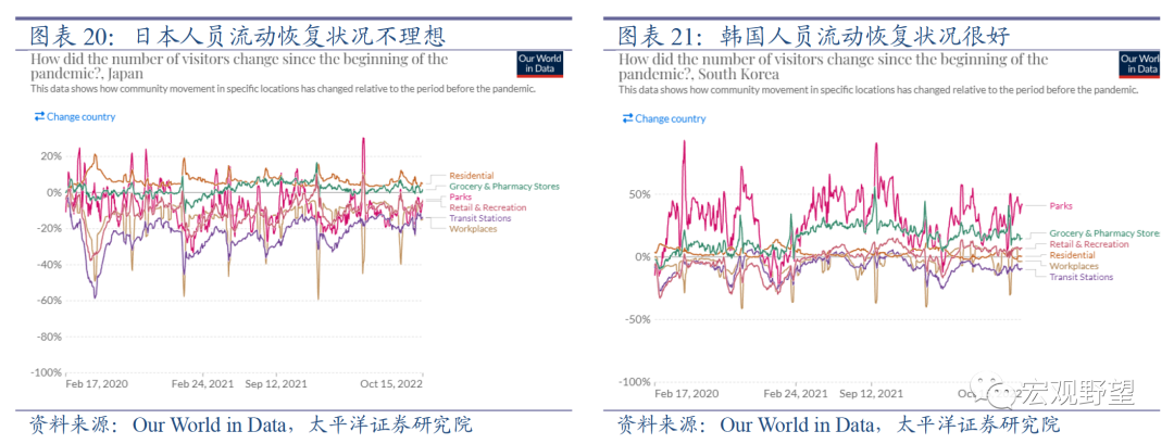 其次我们比较日韩的经验,这两个国家之间也存在较大差异。日本人员流动状况恢复的并不理想,但是韩国人员流动状况恢复的较好,已经基本回到疫情之前的水平。我们认为二者之间的差异可能是疫情防控政策严格程度的不同导致的。以牛津大学编制的新冠疫情防控严格指数来衡量,日本是此前除中国外主要国家之中防疫最为严格的,因而整体人员流动恢复的状况也相对较差。而相比之下,韩国疫情防控政策则非常宽松,各场所的人员流动恢复的状况也非常好。日韩的差异反映出日本人员流动恢复较差可能也并非疫情的长期影响,而是疫情防控政策的影响。