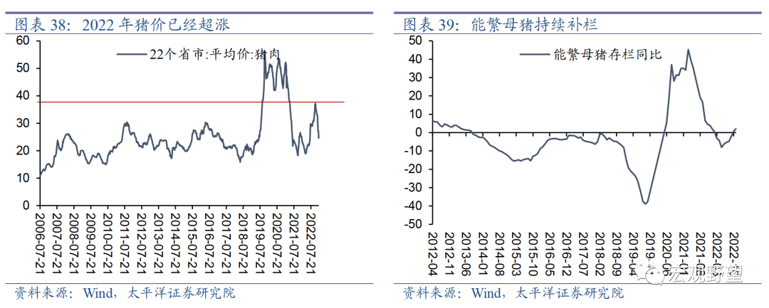 3.2. 全面性通胀的压力不大2023年在全球经济下行甚至衰退的背景之下,工业品价格易跌难涨,中国PPI压力不大。但在国内经济复苏的背景下,CPI有一定上行压力。部分行业比如消费服务相关的价格存在上涨的压力,不过我们认为全面性通胀的压力不大。首先,2023年猪肉价格可能较弱。2022年4月至10月猪肉价格持续上涨,其高点远远超过了2011年及2016年的正常猪周期中的最高价。而在生猪去库存并不是很充分的情况下,我们认为这一涨幅已经在很大程度上超过了基本面所能支撑的范围。在价格的驱动下,4月份之后能繁母猪就开始了持续且较快的补库存,这意味着未来较长时间内猪周期都面临阶段性下行的压力。