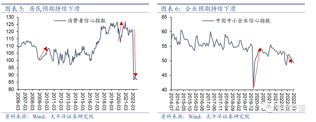 首先,疫情防控政策的不确定性对居民和企业预期的损伤程度加深。在以往的稳增长周期之中,一旦经济触底、政策发力,企业和居民的预期就会出现持续回升。但是2022年并未出现这一现象。虽然政策不断发力,且4月份上海疫情过后诸多经济数据也出现了“V”型反弹,但是居民和企业的信心却没有相应反弹,这与2020年疫情时的演绎完全不同。我们认为2022年疫情最大的影响在于彻底扰乱了居民和企业的预期,不断增加的封控风险给居民收入及企业投资带来的巨大的不确定性,所以居民消费和企业投资的行为都发生了改变,风险偏好大大降低,所以全社会信用扩张受到了很大负面冲击,“稳增长”政策的效果也因而大打折扣。