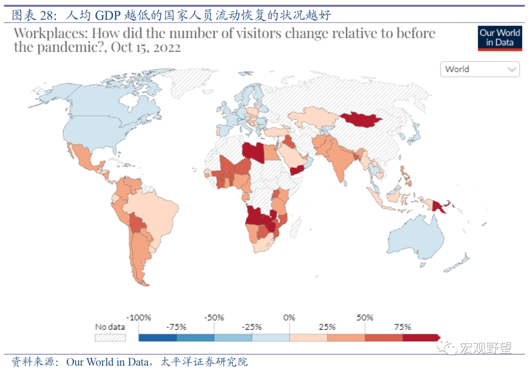 最后我们观察新兴市场和发展中国家的经验,新兴经济体的人员流动恢复的状况普遍非常好。有趣的是,大部分新兴市场国家的人员流动状况不仅恢复到了疫情前的水平,甚至还远超过疫情前的水平。这一情况并非少数国家的特例,而是众多新兴经济体的共性,也就意味着背后有着深层的经济或社会规律。人员流动状况恢复至疫情前的水平容易理解,但为什么会远超过疫情前的水平呢?我们认为这可能与相关国家外出工作的人数增多有关。疫情期间低收入群体的财务状况受到的冲击更大,这部分人群在疫情防控政策放开后有更强的动力外出工作来获取收入,所以人员流动率随之上升,而发展中国家的低收入群体远远多于发达国家,故而宏观上表现为发展中国家整体人员流动率恢复情况非常好。