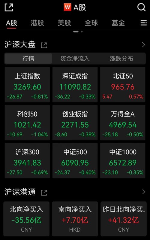 截至发稿,A股主要指数几乎全线飘绿,仅北证50飘红。上证指数跌近1%,大金融、中字头跌幅居前。北向资金净流出超35亿元。