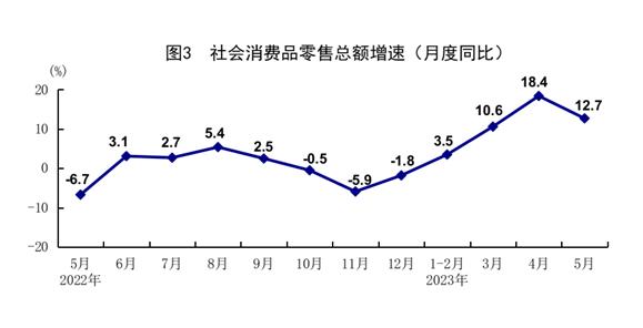 5月份,社会消费品零售总额37803亿元,同比增长12.7%,比上月回落5.7个百分点;环比增长0.42%。按经营单位所在地分,城镇消费品零售额32906亿元,同比增长12.7%;乡村消费品零售额4897亿元,增长12.8%。按消费类型分,商品零售33733亿元,增长10.5%;餐饮收入4070亿元,增长35.1%。升级类商品销售增长较快,限额以上通讯器材类、金银珠宝类、体育娱乐用品类商品零售额分别增长27.4%、24.4%、14.3%。1-5月份,社会消费品零售总额187636亿元,同比增长9.3%,比1-4月份加快0.8个百分点。全国网上零售额56906亿元,同比增长13.8%,比1-4月份加快1.5个百分点。其中,实物商品网上零售额48055亿元,增长11.8%,占社会消费品零售总额的比重为25.6%。