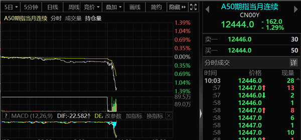 今天早上开盘后不久,A50突然直线跳水,最大跌幅超过1.3%。