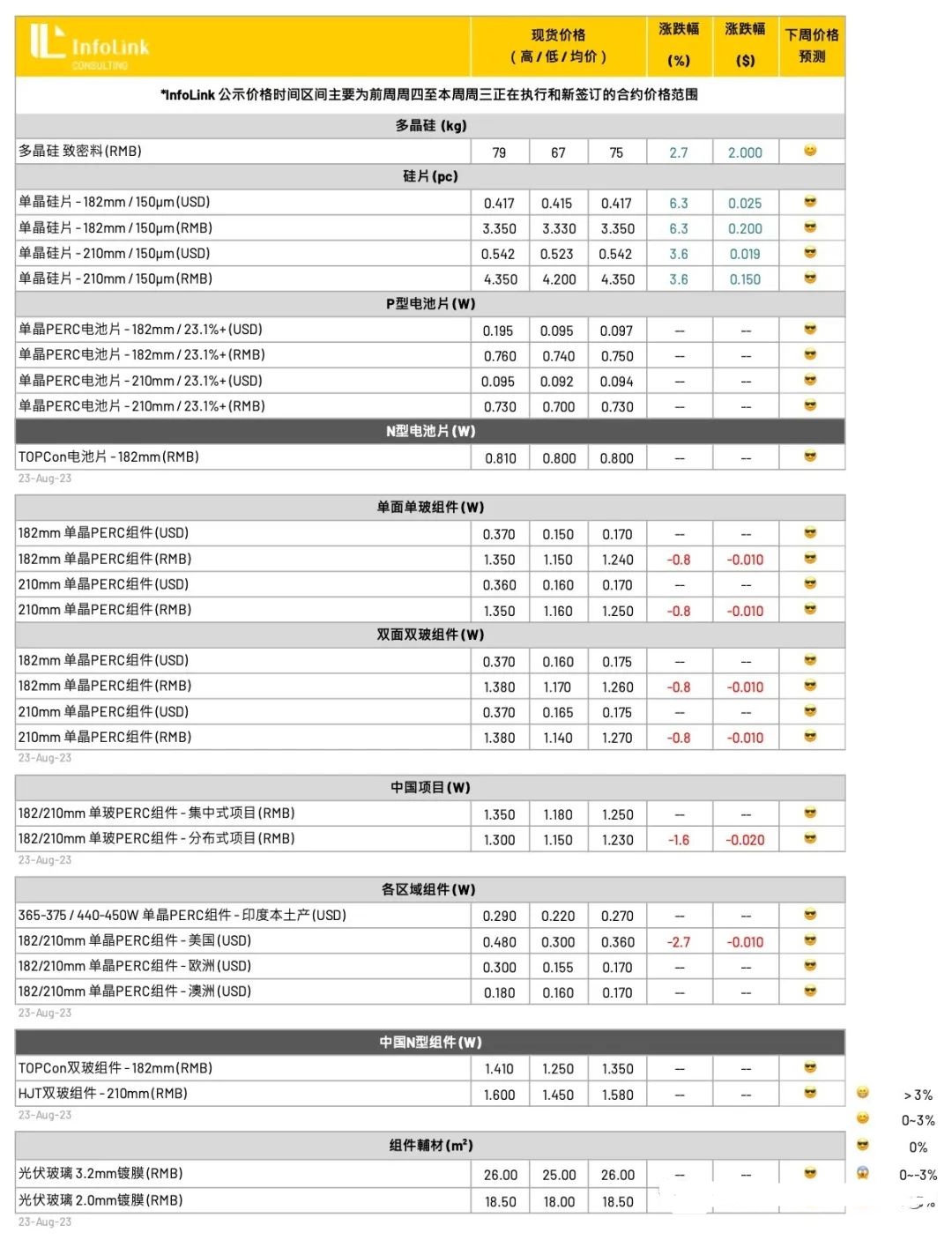 展望后势,电池片环节的价格支撑度正在持续下滑,组件厂家随着前期高价订单陆续执行后,组件价格仍将持续下行,在后续采购力道仍然未看到显著提升下,电池片价格将难维持坚挺。同时,尽管部分厂家因为一体化成本优势仍积极采购电池片,当前已看到部分贸易商、制造商针对低效电池片提前抛货出清,也都显示了市场针对9月份电池环节的价格不复以往乐观。