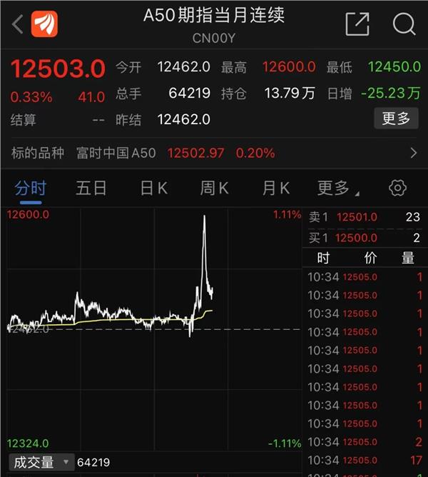 富时中国A50指数期货大涨,盘中暴拉超1%,截至发稿有所回落。