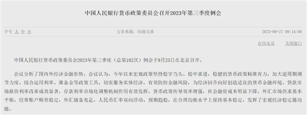 9月27日,人民银行发布消息称,人民银行货币政策委员会2023年第三季度(总第102次)例会于25日在北京召开。