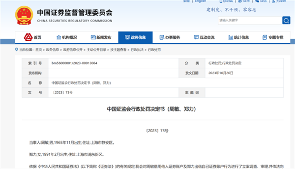 另一则处罚决定书显示,证监会对周敏借用他人证券账户,及郑力出借自己证券账户行为进行了立案调查、审理,并依法向当事人告知了作出行政处罚的事实、理由、依据及当事人依法享有的权利,当事人未提出陈述、申辩意见,也未要求听证。本案现已调查、审理终结。