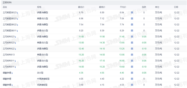 证券之星新能源车行业周报:据上海有色网,截止12月22日,电池级碳酸锂9.4-10.5万元/吨,均价9.95万元/吨,环比上一工作日下滑0.05万元/吨;工业级碳酸锂8.8-9.3万元/吨,均价9.05万元/吨,环比上一工作日下滑0.05万元/吨。近期下游正极材料企业对碳酸锂的采购需求依然疲软,而市场中个别锂盐企业依然存出货意愿,供需博弈下市场碳酸锂现货价格仍弱势运行。另外,近期贸易企业出货情况同样不容乐观,部分贸易企业后续有交仓想法。