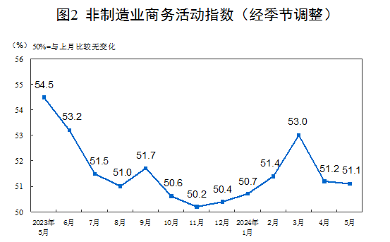 5月份,非制造业商务活动指数为51.1%,与上月基本持平,非制造业继续保持扩张。