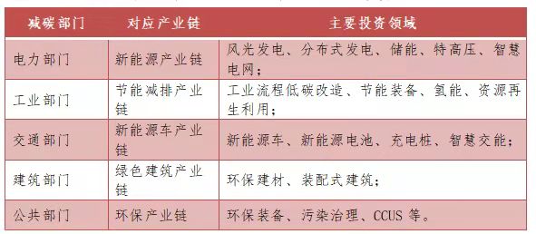 碳中和的减碳路径,对应着五大产业链:电力部门脱碳对应新能源产业链,工业部门减碳对应节能减排产业链,交通部门减碳对应新能源车产业链,建筑部门减碳对应着绿色建筑产业链,公共部门减碳对应着环保产业链。