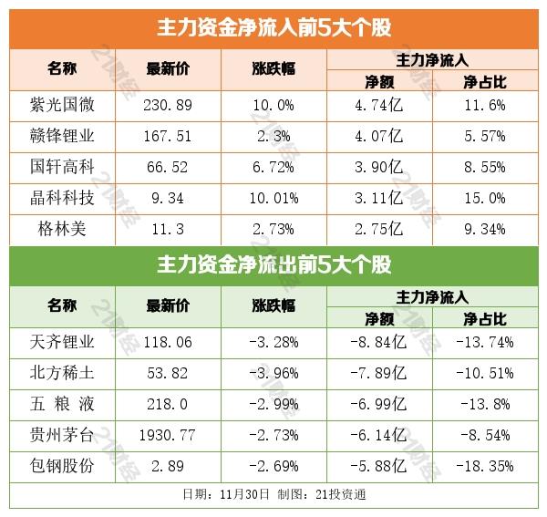 个股方面,北向资金净买入紫光国微(002049.SZ)、赣锋锂业(002460.SZ)、迈瑞医疗(300760.SZ)、亿纬锂能(300014.SZ)、凯莱英(002821.SZ)居前。