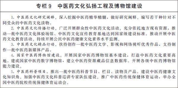 2.发展中医药博物馆事业。开展国家中医药博物馆基本建设,建成国家中医药数字博物馆。促进中医药博物馆体系建设,强化各级各类中医药博物馆收藏研究、社会教育、展览策划和文化服务功能,加强数字化建设,组织内容丰富的中医药专题展览。